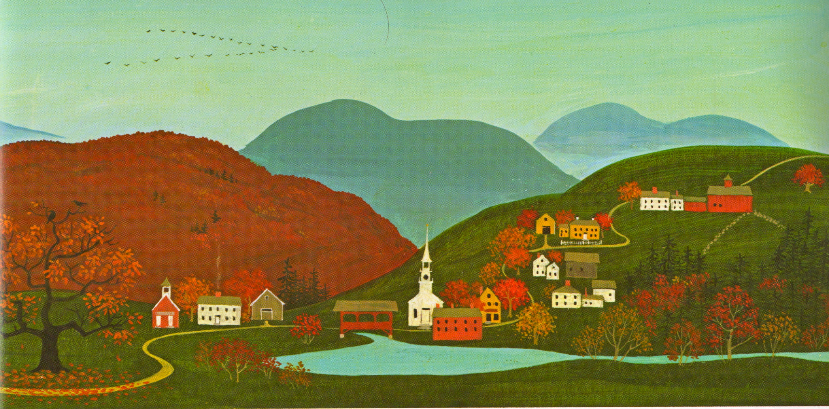 Ox-Cart Man by Donald Hall, illustrated by Barbara Cooney, is a book that draws in my daughter. The ox-cart man and his family work hard through the seasons to make wares for him to sell in town. “When his cart was full, he waved good-bye to his wife, his daughter, and his son and he walked at his ox’s head ten days over hills, through valleys, by streams past farms and villages. . .” (page 10). Blue mountains and the flaming colors of a New England autumn spread across two pages as the ox-cart man walks a winding road. “I wanna go there, mommy,” she says when we reach that page. “Me too, sweety!” Who doesn’t?