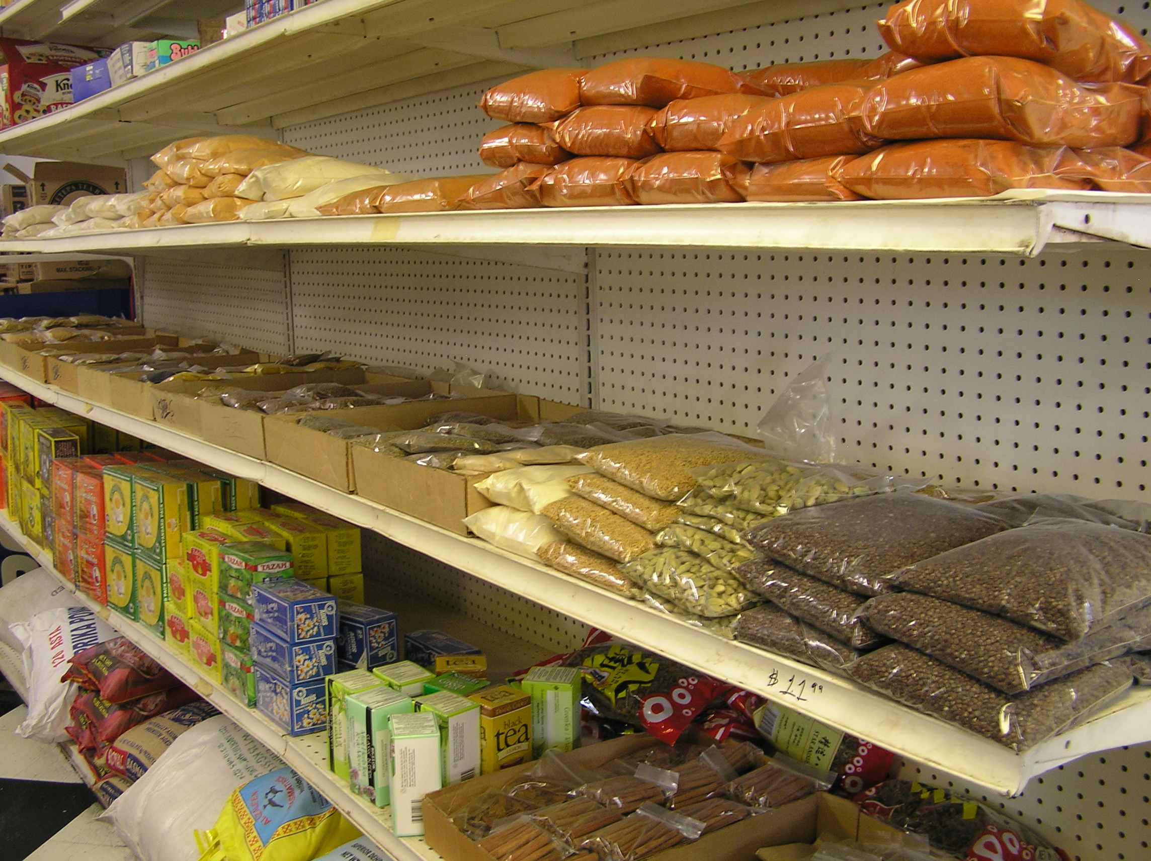 The glorious spice aisle – bags of cardamom pods, cloves, cinnamon sticks, unground pepper and other fragrant delights. Any variety of hot chilli powders. Tea, tea and more tea!