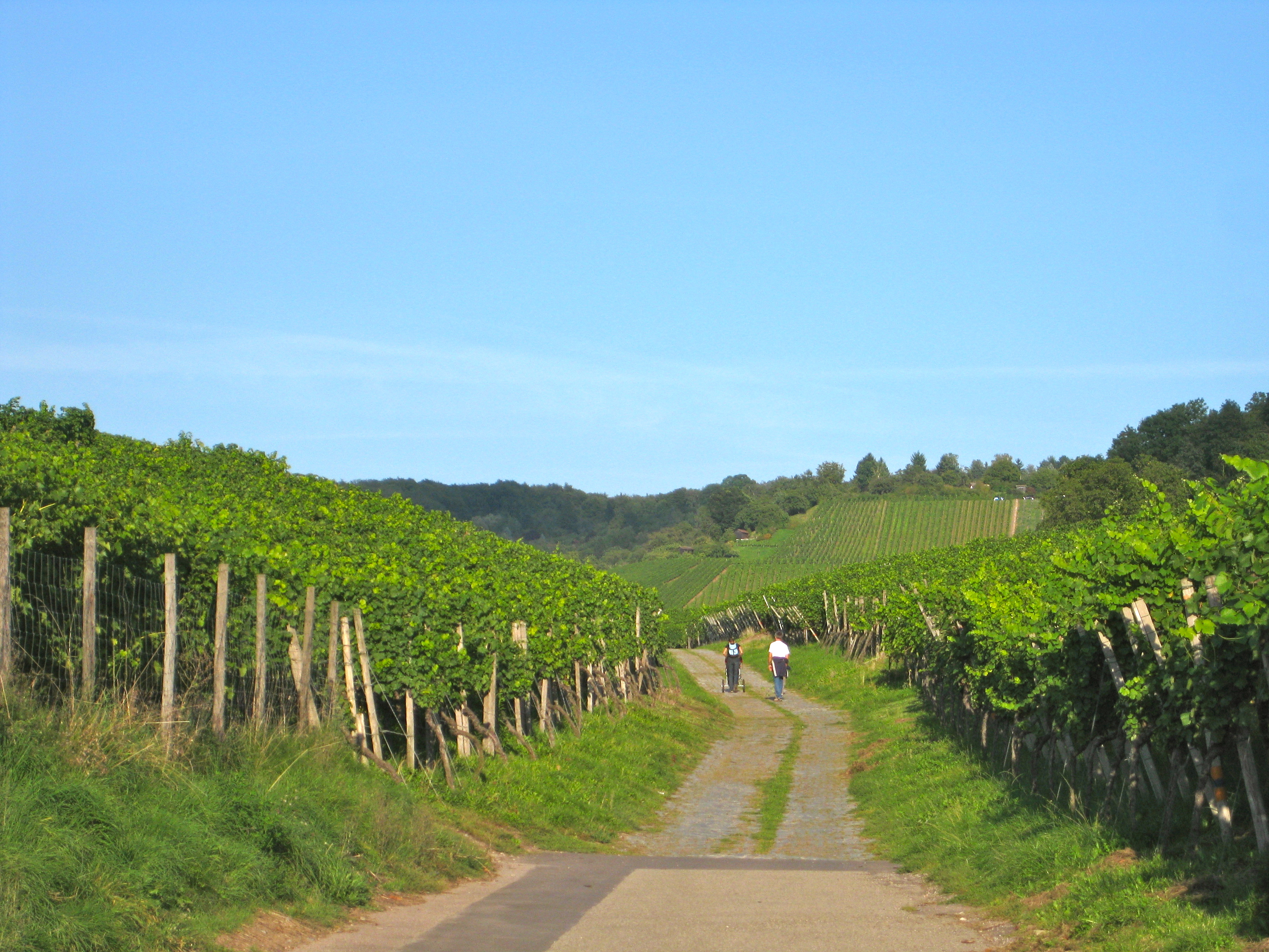 We spent a most stunning family Sunday afternoon wandering the Stuttgart weinstrasse (wine routes) near Unter-Turkheim one German autumn. Paved paths through the open vineyards provided a stroller-friendly environment as we worked our way up the hillside, anticipating the panoramic views from the top of the terraced banks. In Germany, Sunday is the day for walking. We strolled along with other local families who had been enjoying the rich Sunday wandering tradition through these vineyards for centuries. Even a teetotaler can revel in this experience.