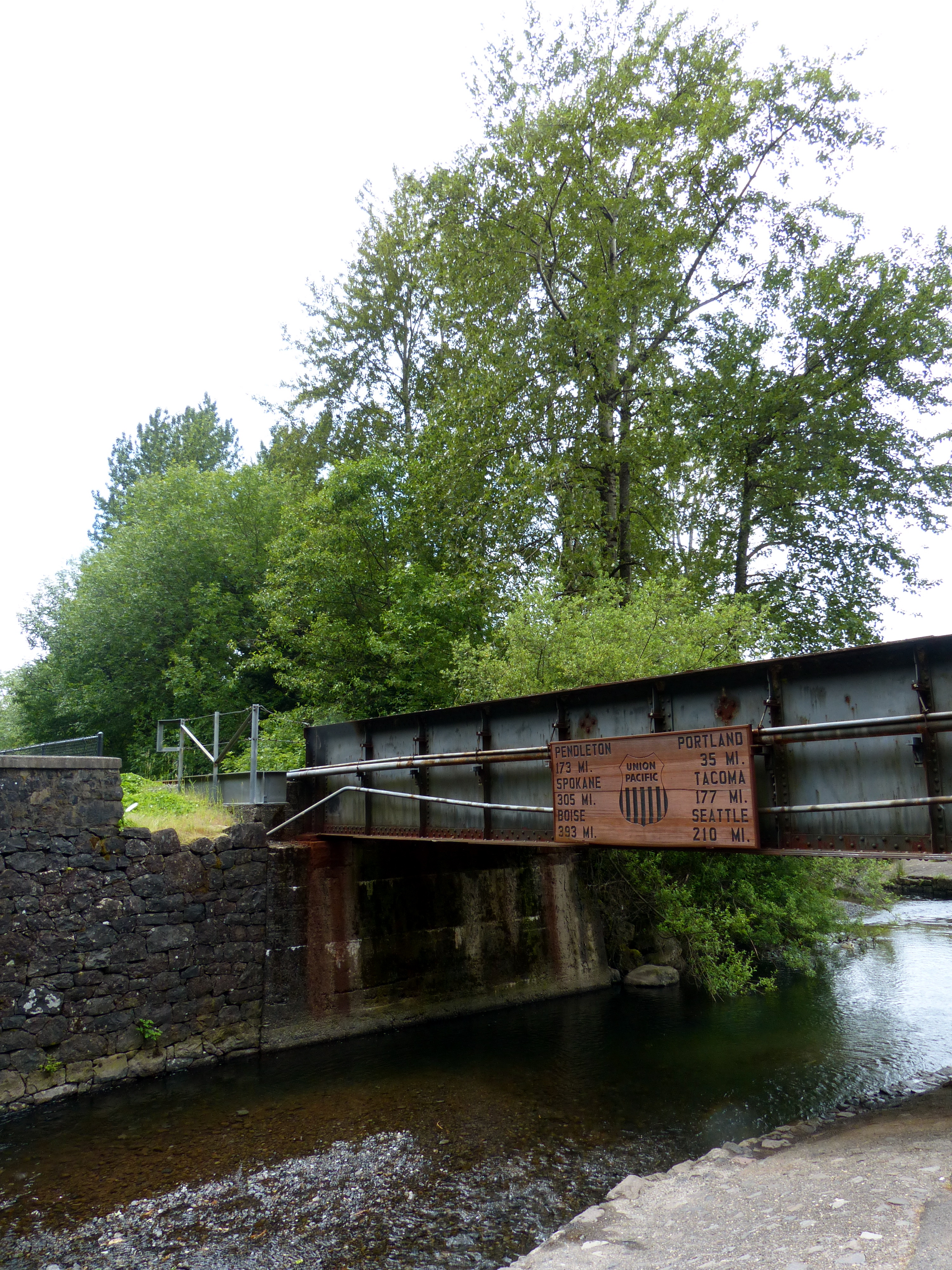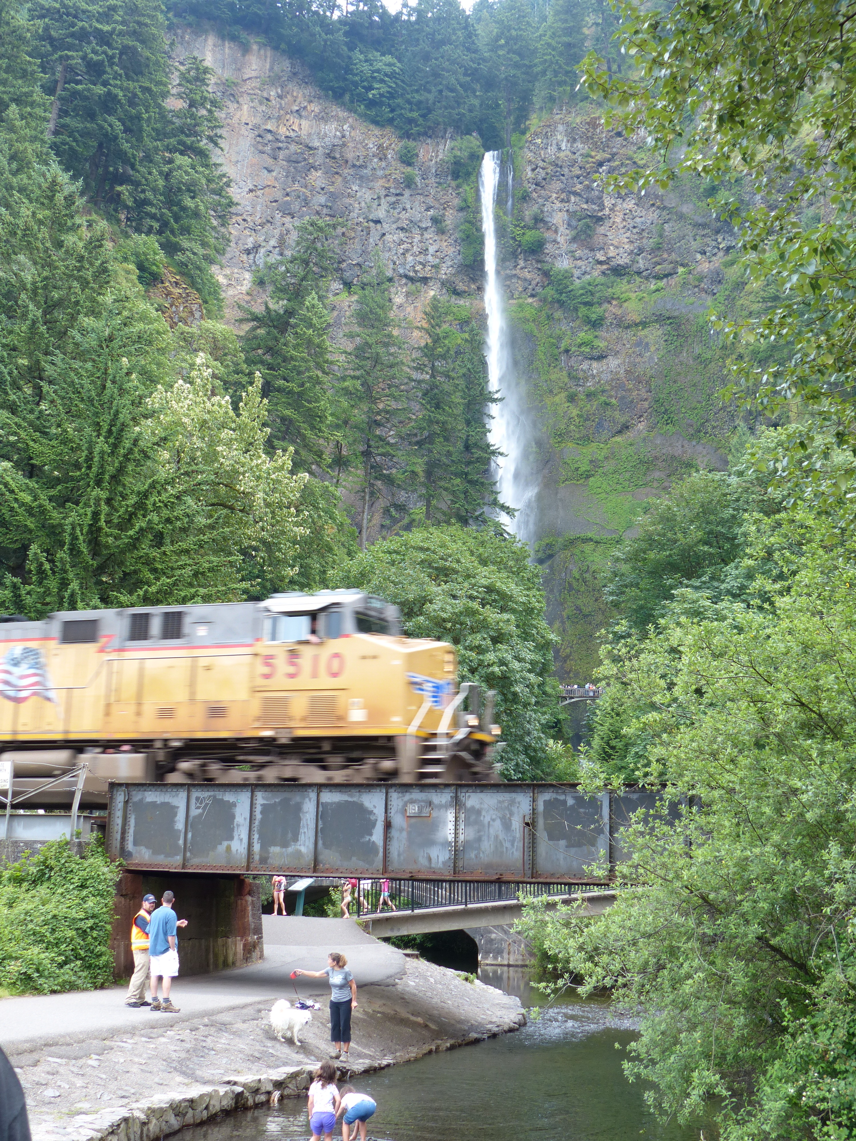 This was the state of my mental play as we closed the left-hand exit to the Multnomah Falls viewing point from Interstate 84 along the Columbia River. The flashing construction marquee advised us the parking lot was full, so we made quick plans to observe the falls in series, with me as driver circling the lot while Ms. WTWK traversed the highway and railroad underpass to snap a few shots. Both our girls were in nap-land, and had not passed the critical 90 minute elapsed nap-time for afternoon rest, so we made our game plan with quiet as a principal aim and used individual viewing of the falls as our MO, vice a collective, nap-rousing family outing to the viewing point.