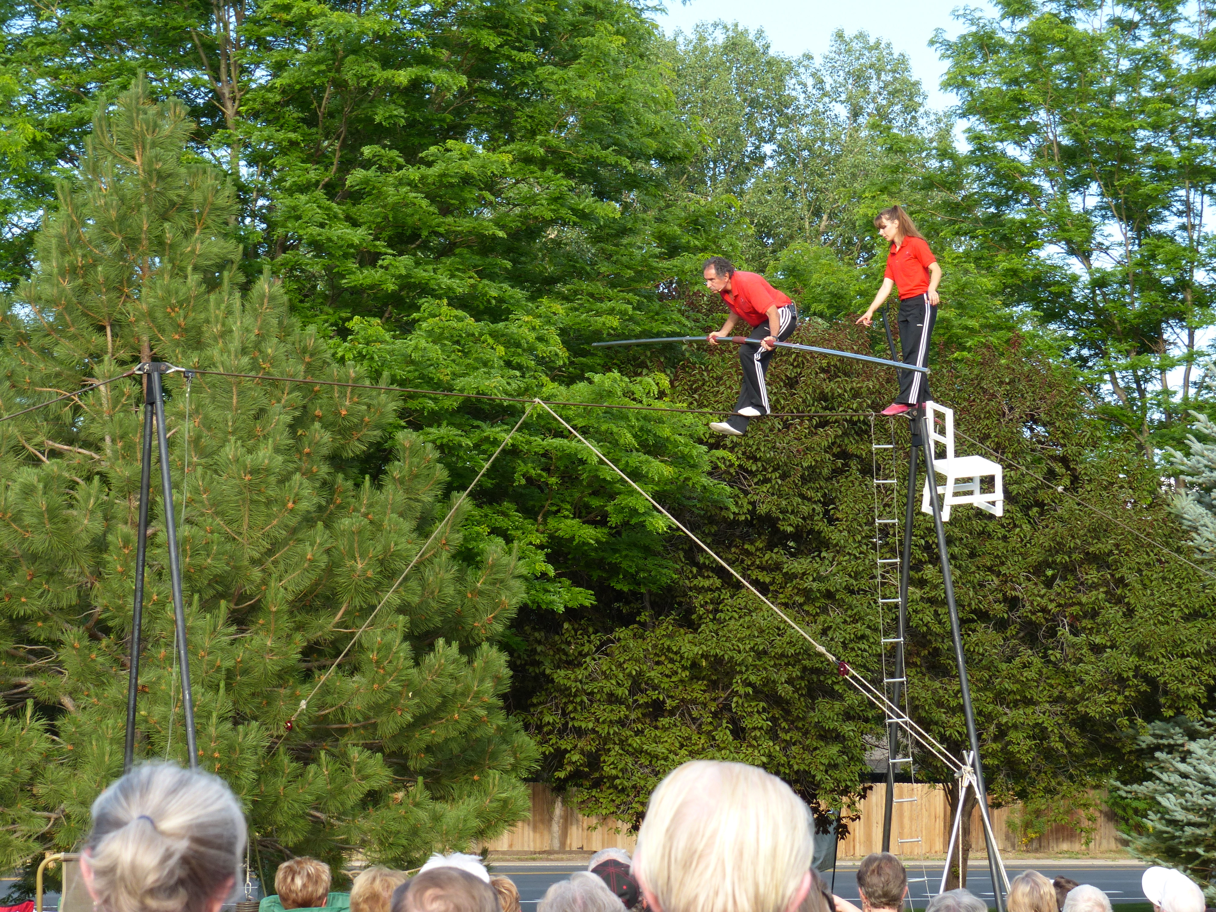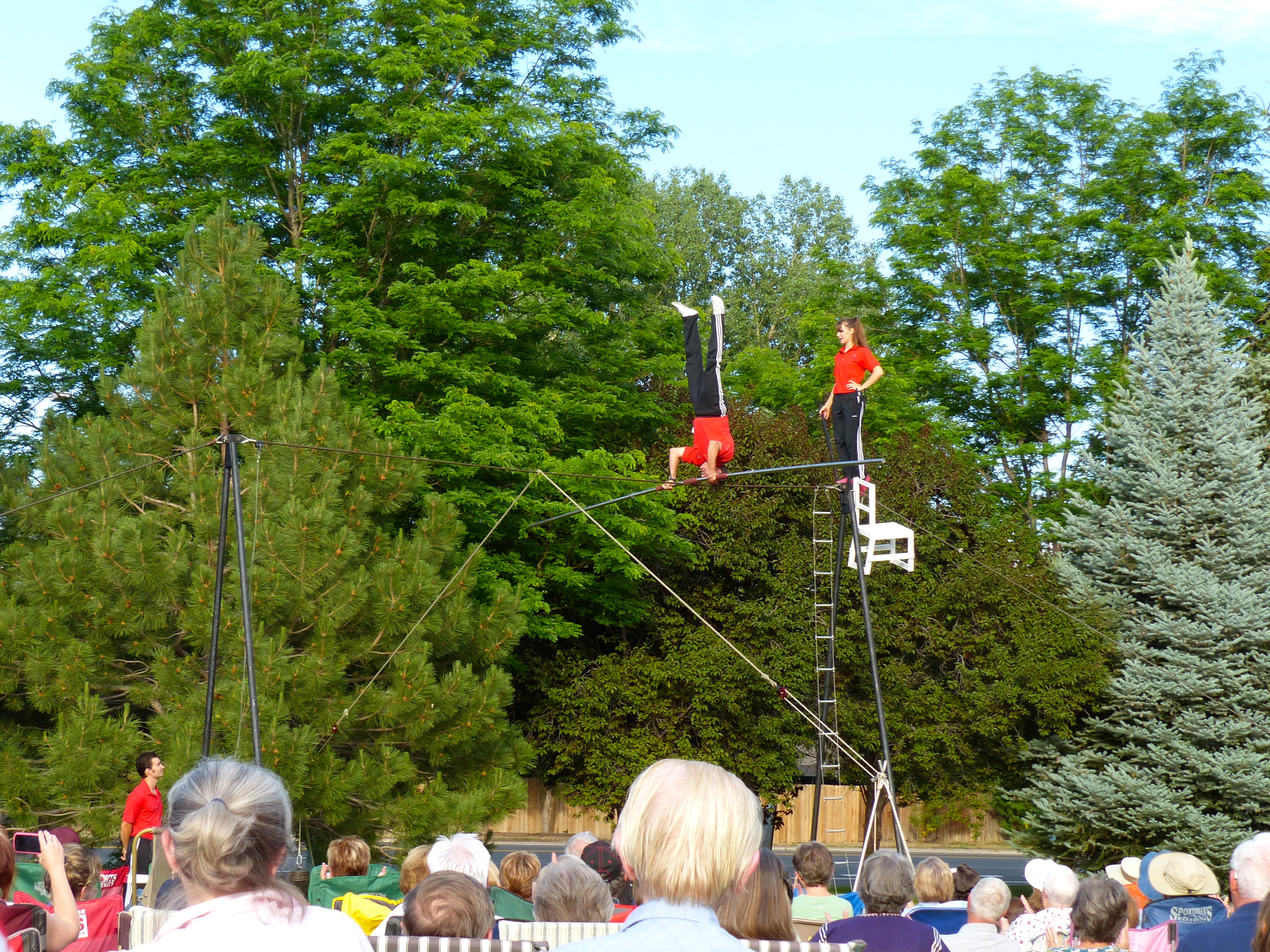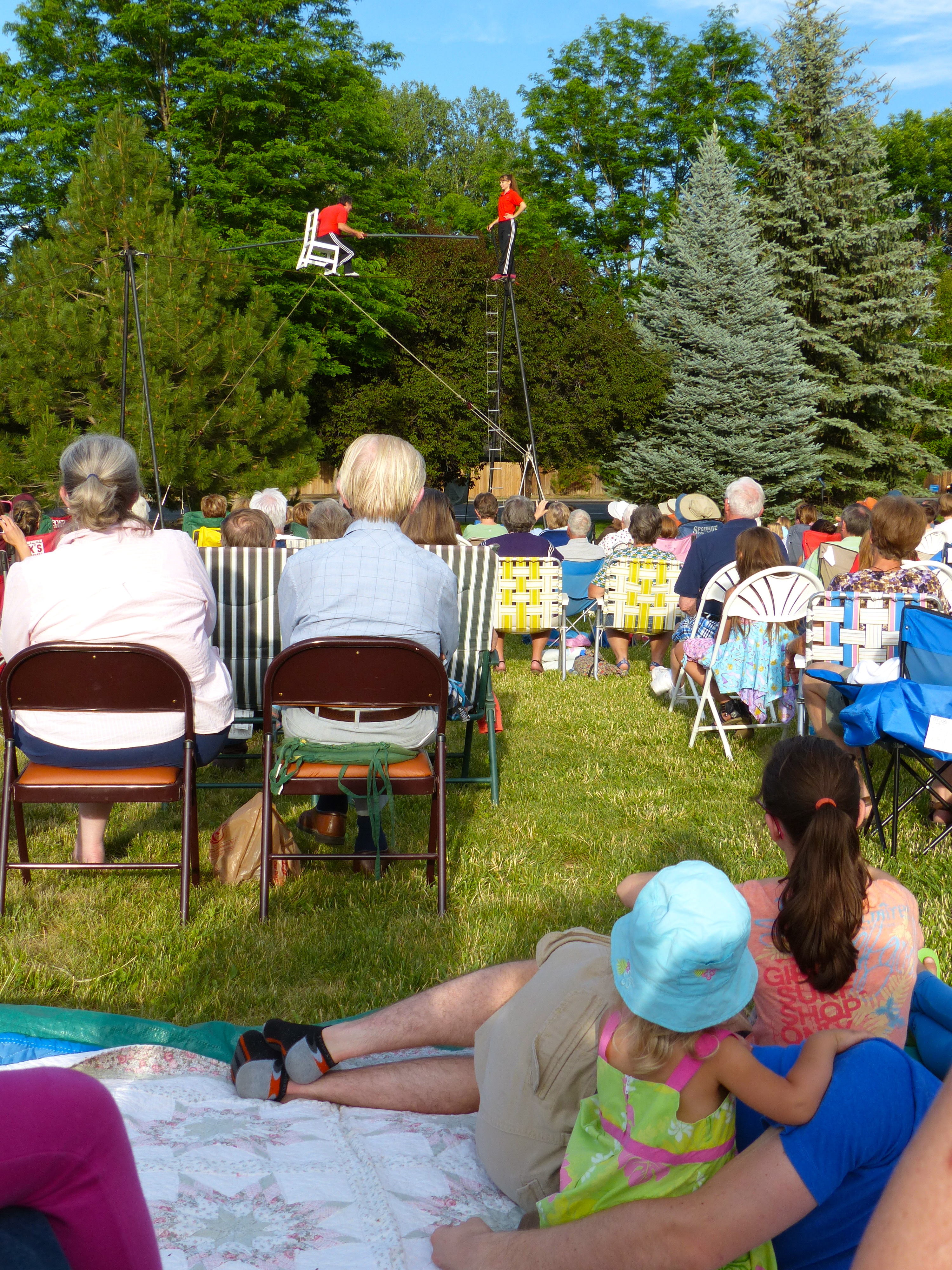 I often find excellent children’s books at thrift shops. One book I picked up takes place a century ago in Paris and deals with the issue of an acclaimed tightrope walker who becomes afraid and is no longer able to perform. I chose the book primarily because it was a Caldecott Medal winner. The Caldecott Medal is awarded every year to an artist for the most distinguished American children’s picture book. Mirette on the High Wire quickly became a favorite during story time. Mirette, an innkeeper’s young daughter, watches the tightrope walker practice in the early mornings and determines she could do the same. With persistent, consistent practice and good coaching she becomes the famed wirewalker’s protege and helps him lose his fear of the wire. As a result of this book, my daughters were very familiar with the concept of tightrope walking. So, imagine my surprise and excitement when we found out a family of wirewalkers was going to be performing in Loveland, Colorado during our stay there on our our road trip!