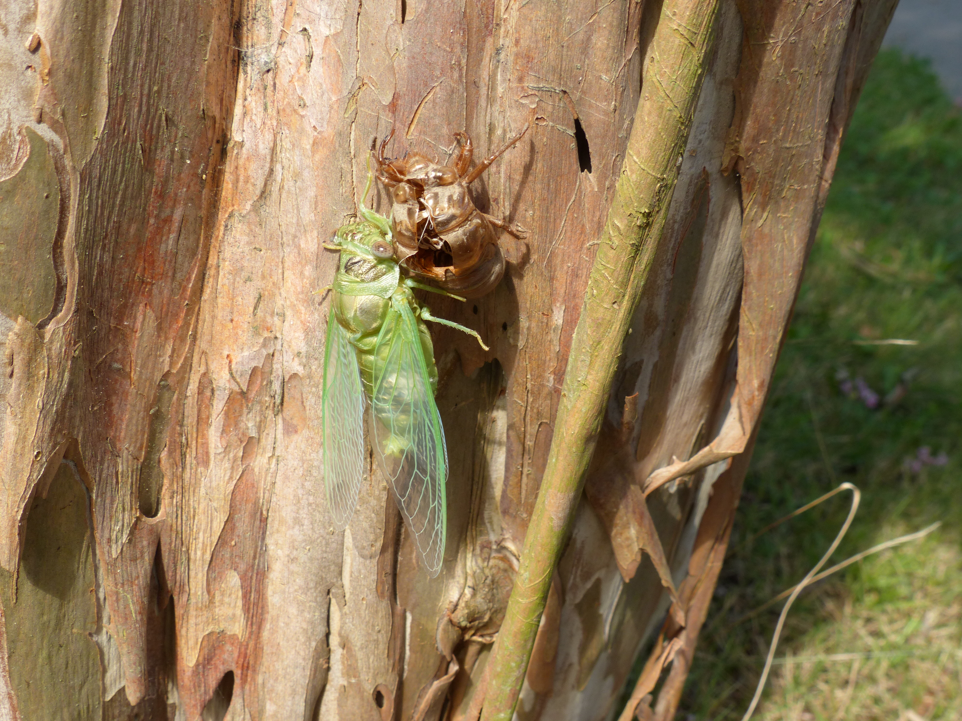 I found a youtube clip with a time lapse of a cicada emerging from the skeleton. It even had music accompaniment. The girls were fascinated. I also found some coloring pages of cicadas online, which I printed and they promptly covered in vibrant butterfly-like hues. And I redeemed the original trauma of the skeleton on Little P’s finger. Cicadas were not to be feared. Cicadas were cool.