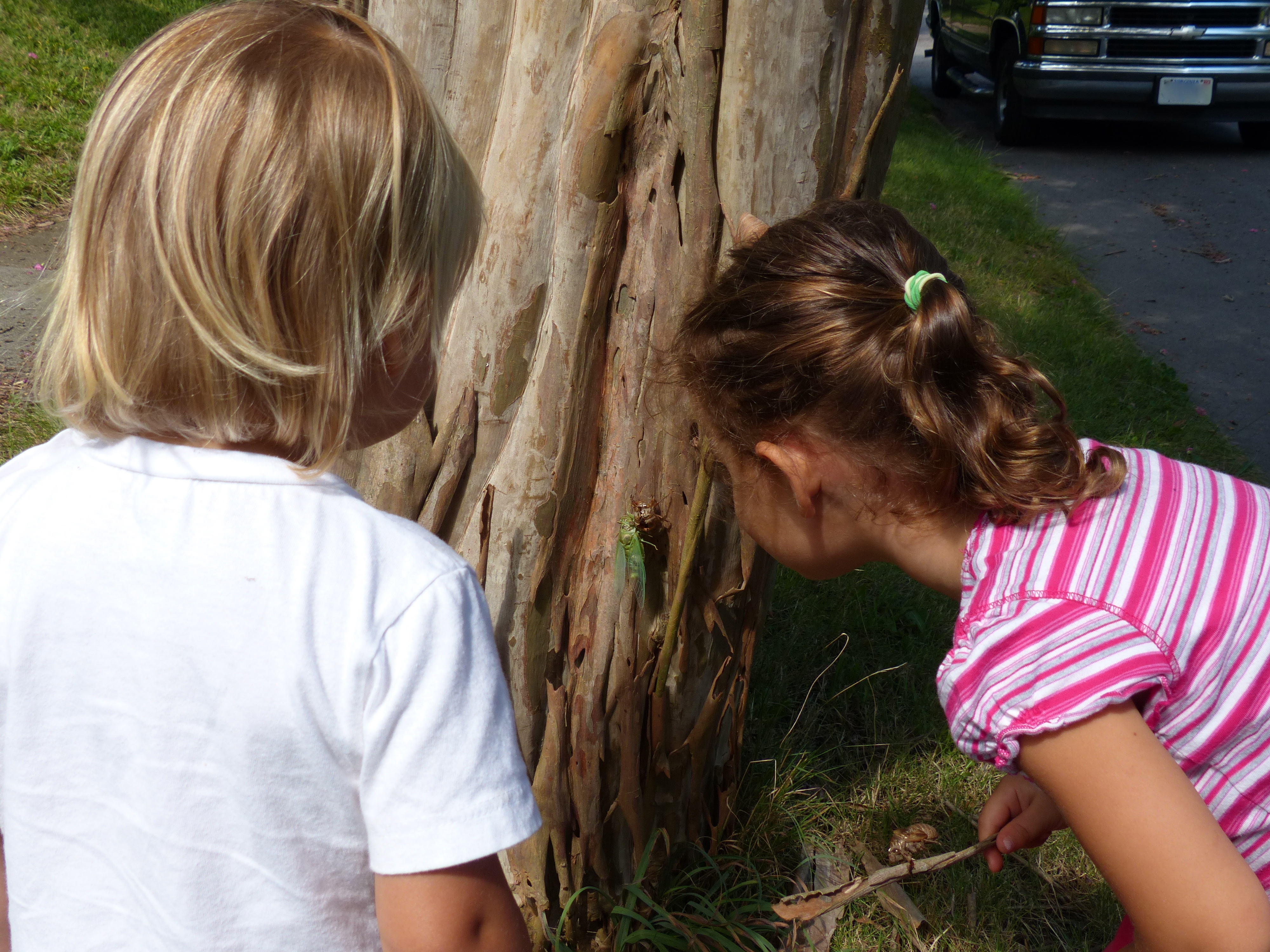 To my horror, on the next tree, at kid eye level, I spied a large, green fresh cicada emerging from his shell. Oh, how neat! I was disgusted by its appearance, but this was such a teachable moment. We peered in close at its bulging eyes and delicate wings. Insects are a fascinating aspect of creation, but still totally gross. A praying mantis has bulging eyes, but they’re kind of cute in a “that-bug-prays” kind of way. And butterflies have delicate wings, but they are colorful and attractive to the human eye. They are butterflies. Cicadas are just nasty. Several inches long, they are something you might expect to find in the Amazon, not mild Virginia. Cicada bodies must have been used as models for alien beings in movies where the aliens invade earth and dissect humans. If they were a pest in the home and needed to be killed, they are too big to squash with your foot. They would crunch and you might actually be able to hear them make some sort of screaming noise. It would be traumatic. With these thoughts passing through my mind, I smiled and nodded at the girls as they watched the creature in awe. They poked at it and I cringed, imagining it flying into one of their faces and all of us screaming – again, for a harmless creature. He must have just emerged because our poking abuse didn’t cause him to stir much. Making up some excuse about it getting hot in the sun, I told the girls it was time to go in. But the educational experience would continue! Can’t pass up an opportunity like that.