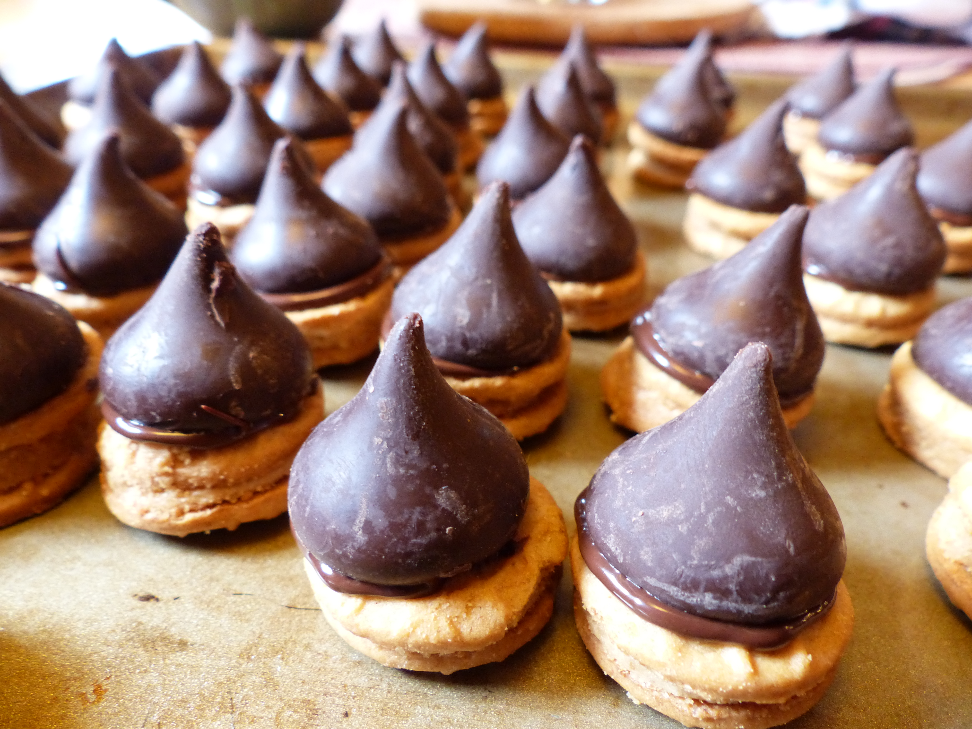 I like to make edible acorns with the “help” of my daughters. This is something I would have never made growing up as these highly processed, non-nutritious items aren’t available most places outside North America, save the occasional military commissary overseas. In fact, I don’t think Nabisco had yet invented the mini-Nutter Butter when I was four. My girls do have certain benefits growing up in the 21st century. Here’s what you need: mini Nutter Butters, dark chocolate Hershey kisses and mini chocolate chips.