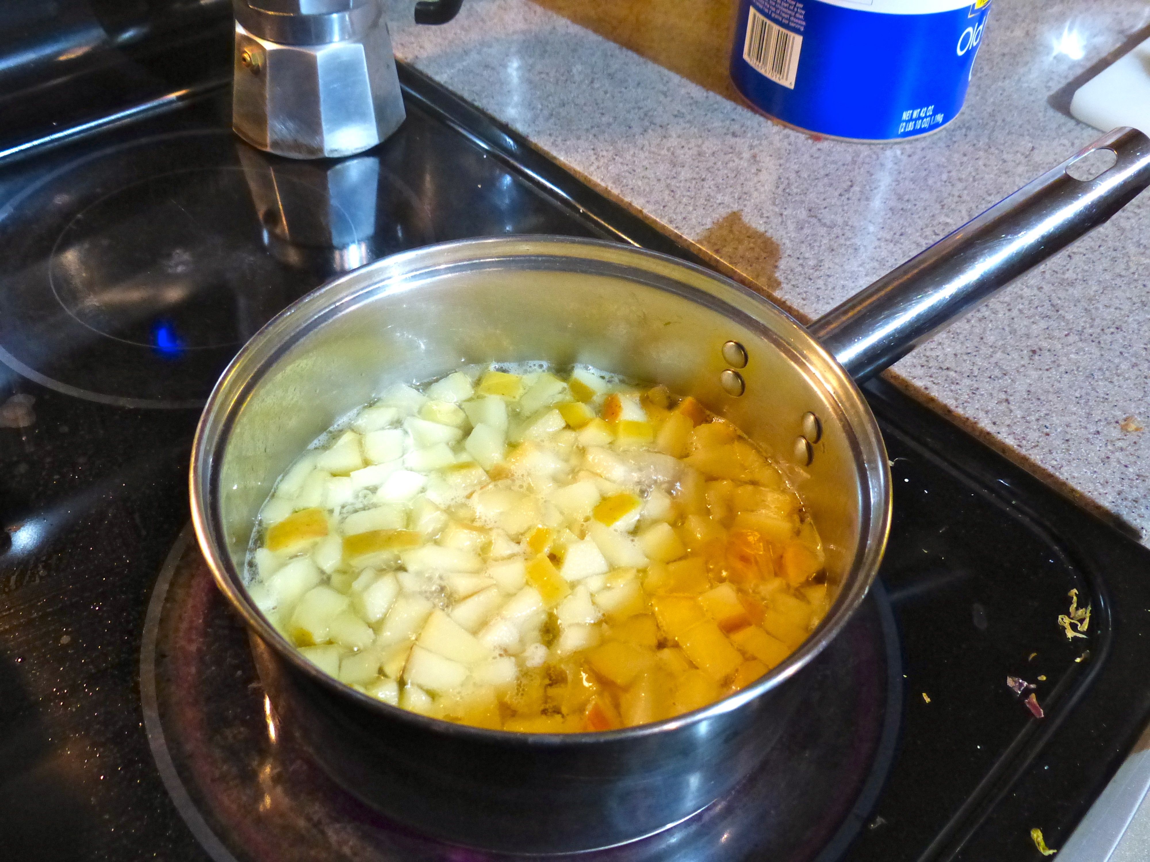 Prepare the ingredients while bringing the water to a boil. I find it’s more efficient if I run around the kitchen and grab all the items at once before I begin to cook. Do I always collect them before I cook? Hardly. It’s a challenge remembering to be efficient first thing in the morning.