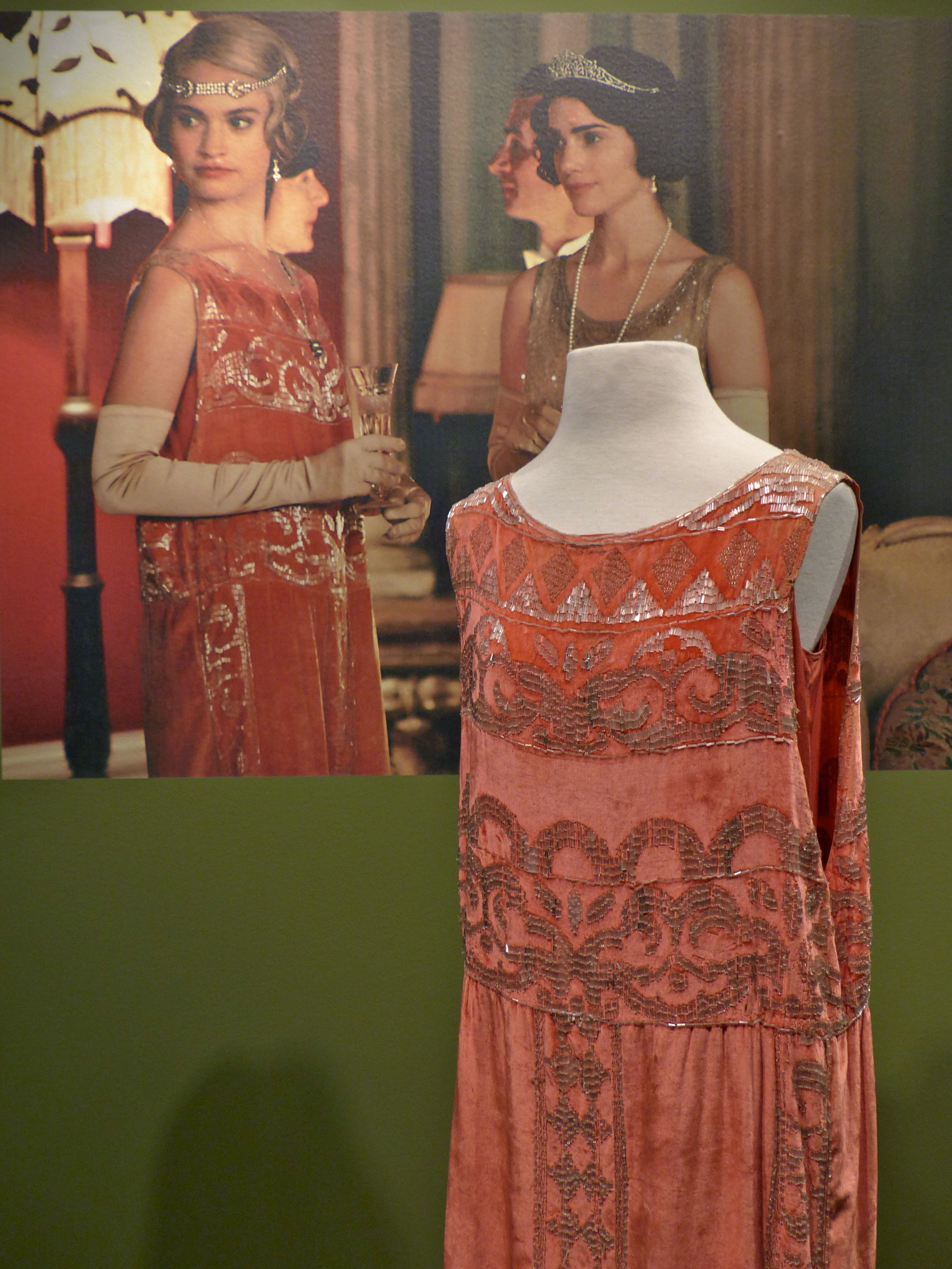 Men and women, young and old, multi-generational families – they all came for one purpose. In this parched viewing land between seasons, they come to taste of Downton Abbey. Though it takes a mere 45 minutes to view the collection, it does not disappoint. This is the fashion of the Downton Abbey – forty notable outfits warn by characters throughout the seasons. But these are not simply costumes, they are real clothes, some original pieces from the period, restored to live again in glory on screen. When I watch the series, I’m usually engrossed in the storyline, but I’ve increasingly come to appreciate the eye candy – the décor, costumes and even the culinary masterpieces put before the characters several times in each episode. The series is notable for its attention to detail and period authenticity in most areas. The costumes, of course, are no exception. The exhibit at the Winterthur Museum, located near Wilmington, Delaware, in the United States, describes the process of designing and creating costumes for the characters, paying particular attention to fabrics and colors. This is only fitting for Winterthur, considering it hosts one of the most extensive collections of 18th and 19th century printed textiles in the United States. In several sections of the exhibit, video screens loop notable scenes, with costumes from the scene on display. In other areas, life-size photographs are the backdrop to the fashion, with placards explaining the piece’s significance. For Downton Abbey novices or those who may not be particularly interested in fashion, the exhibit gives an outline of the show, its context in history and relates the life of Downton’s characters to individuals who lived in Winterthur, which had its own upstairs and downstairs. One particularly notable aspect of the exhibit is how it places television script opposite photos and a specific dress or suit. As I read the script with the visual cues, the particular scene came alive in vivid detail. Who needs to watch a scene on screen when all the ingredients for a perfect drama are perfectly laid before you?