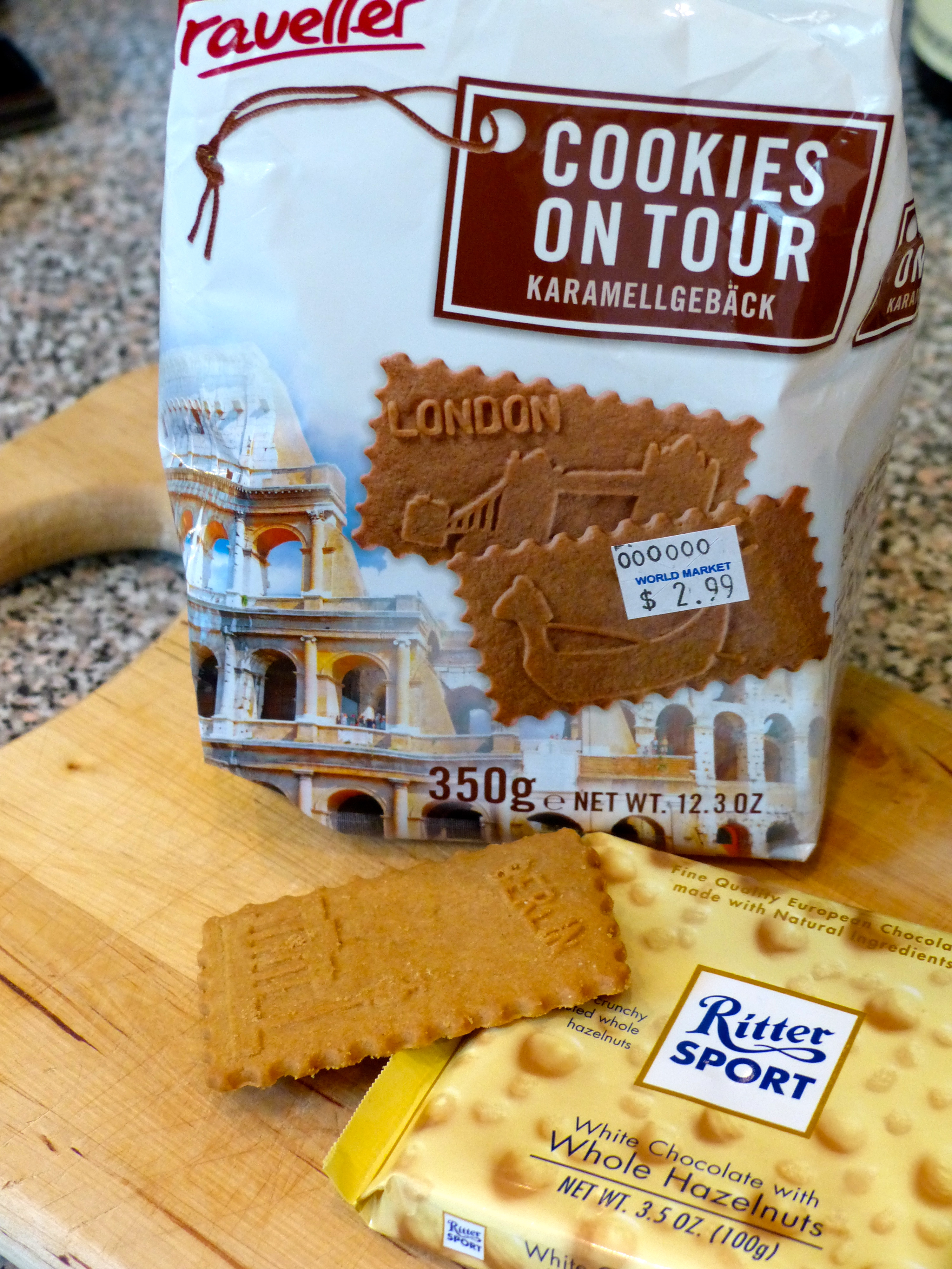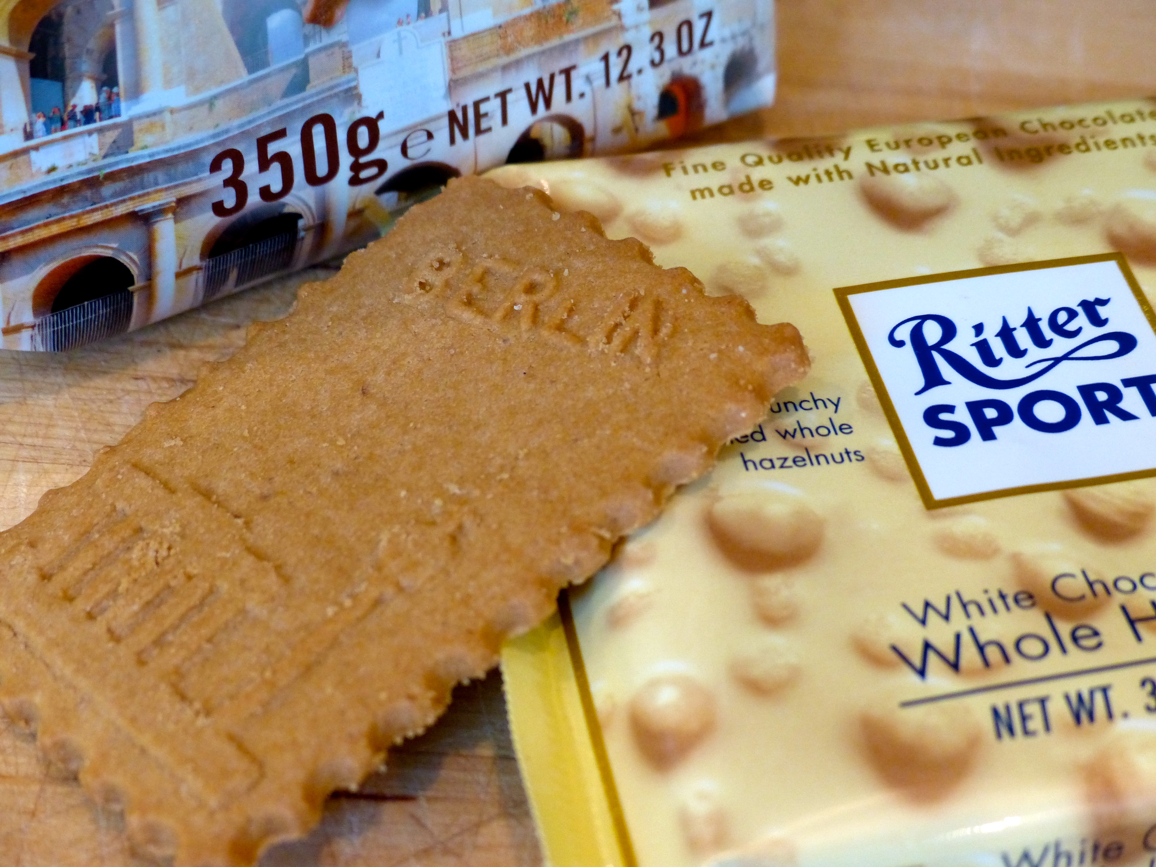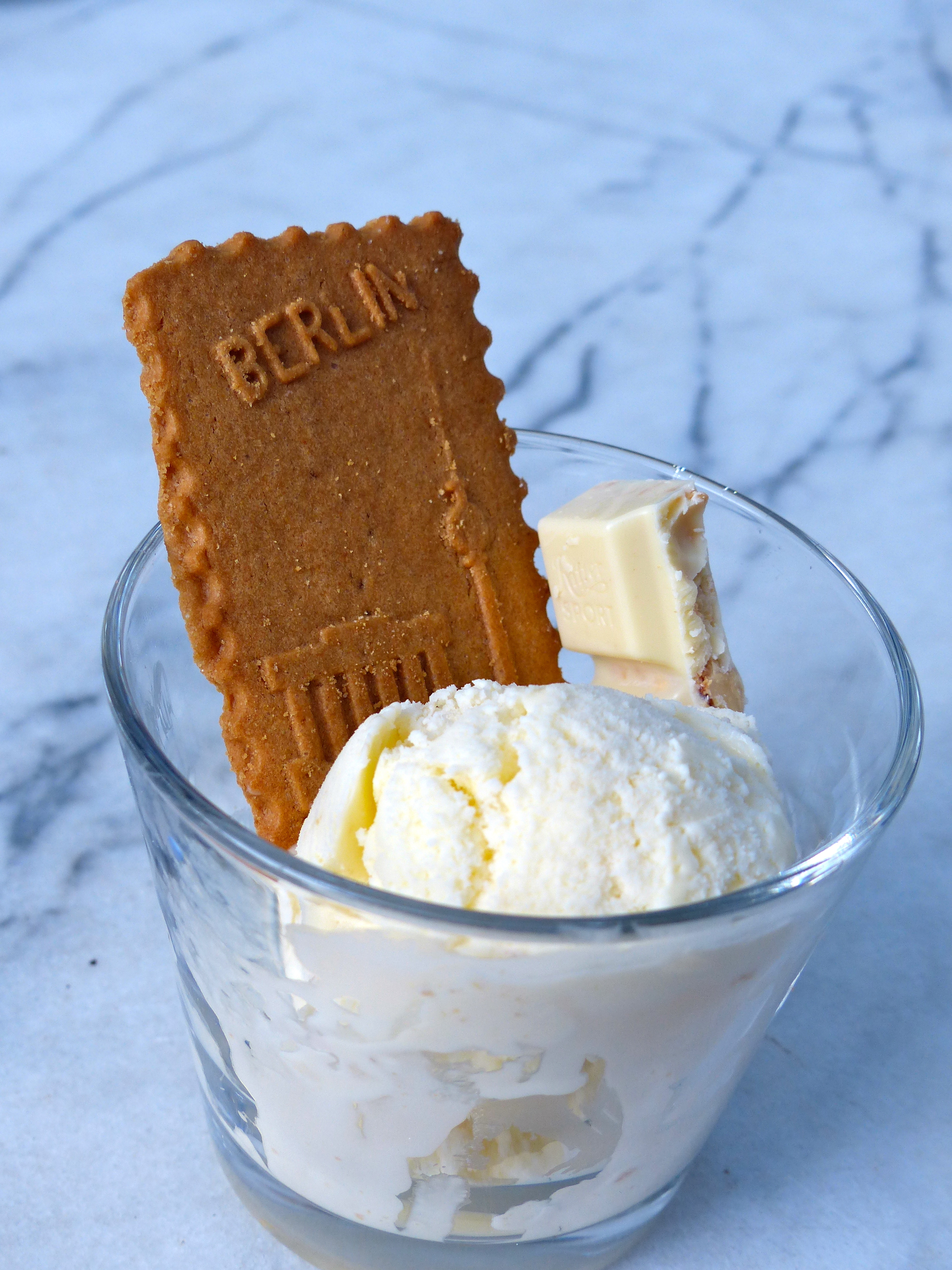 It’s the little things that trigger happy memories – memories of family togetherness during travels or times living abroad (or in another state). Little things like dessert. World Market does it to me every time. For a minuscule obligatory donation, I return home with an edible item that will trigger smiles, laughter and stories of times gone by. Most recently it was German ice cream. The ice cream didn’t start out German, however. It started with a batch of homemade vanilla ice cream, a favorite Rittersport Chocolate bar (made near Stuttgart, Germany), and travel biscuits of the British type, i.e. a cookie. I crushed up half the chocolate bar and several cookies from less enticing destinations (uh-hum, Las Vegas) and mixed them with the softened ice cream. After refreezing the batch, I selected an appropriate biscuit with which to garnish the edible memory-inducer. This being “German” ice cream, I selected a Berlin biscuit.