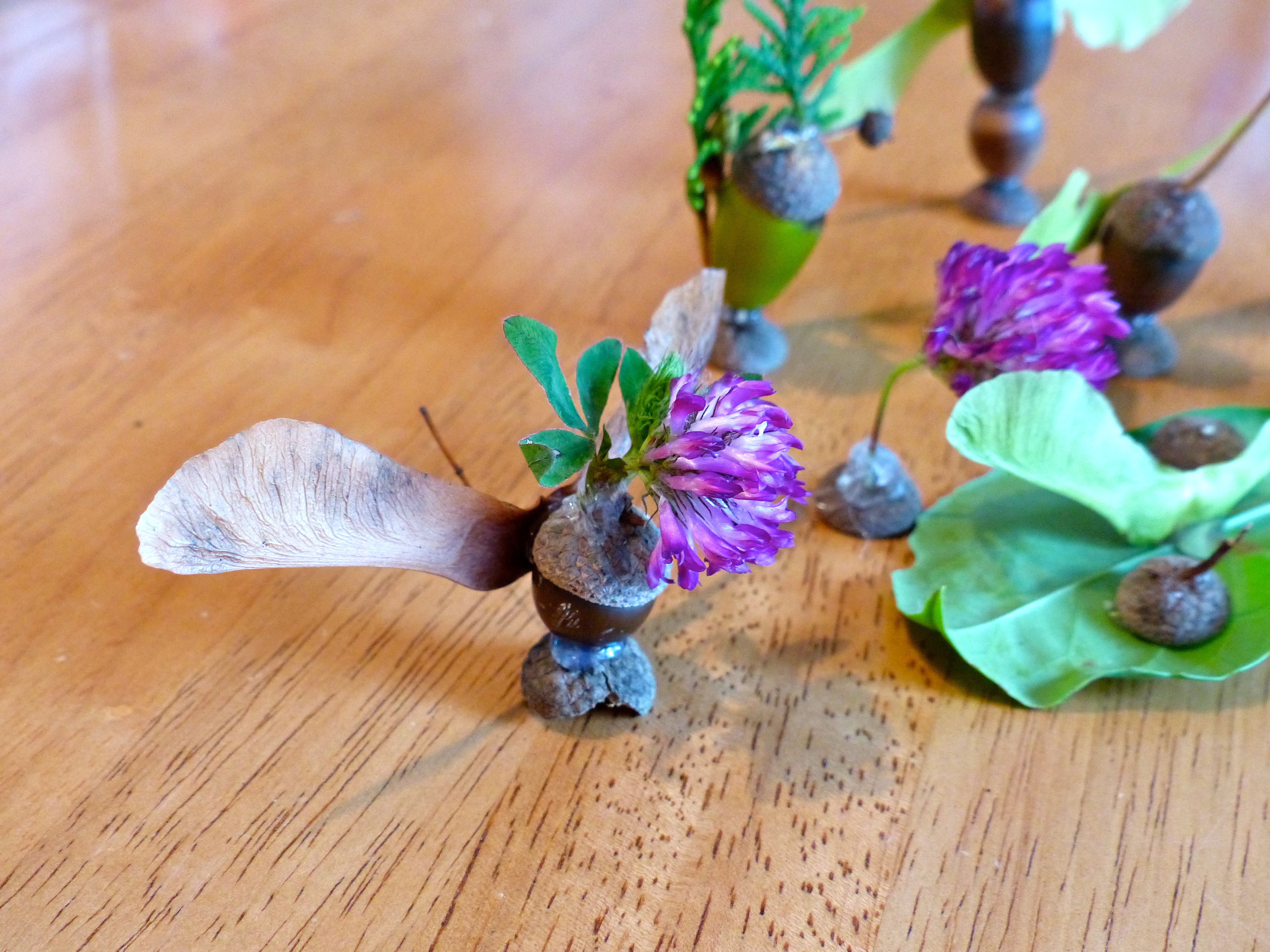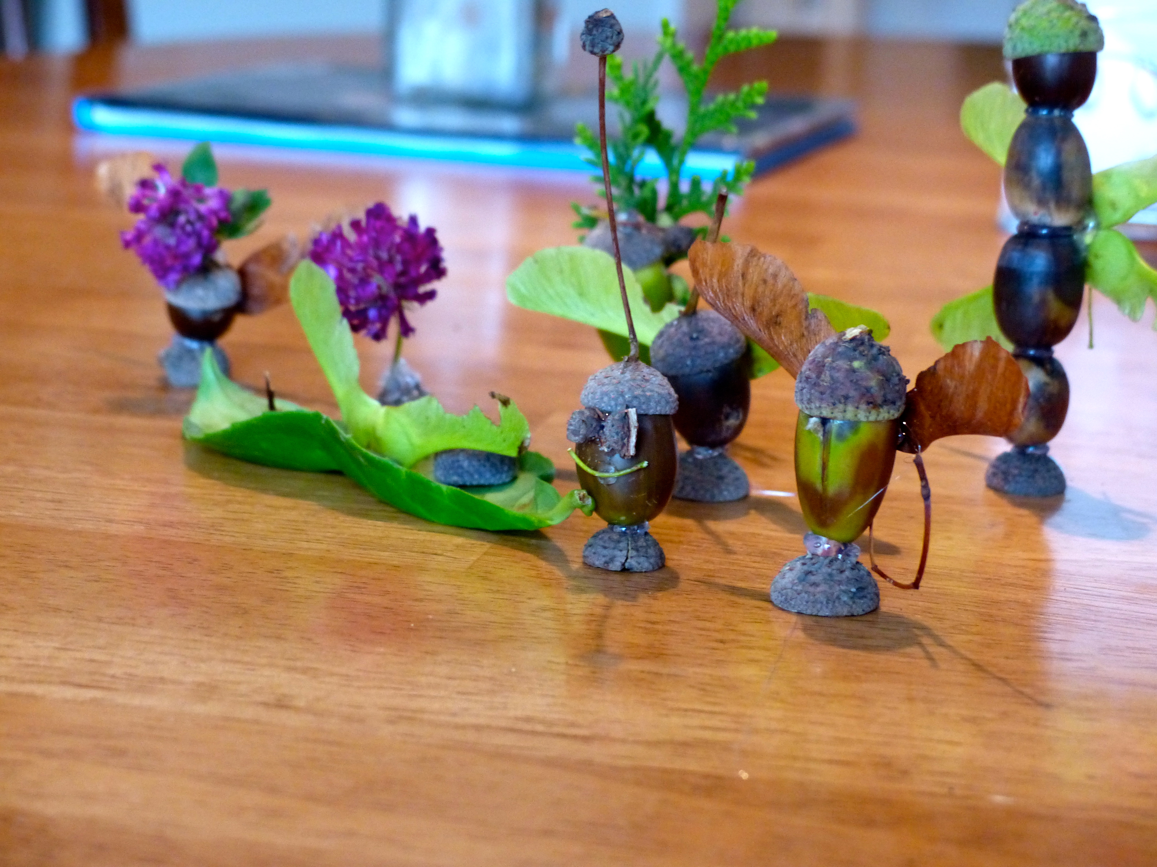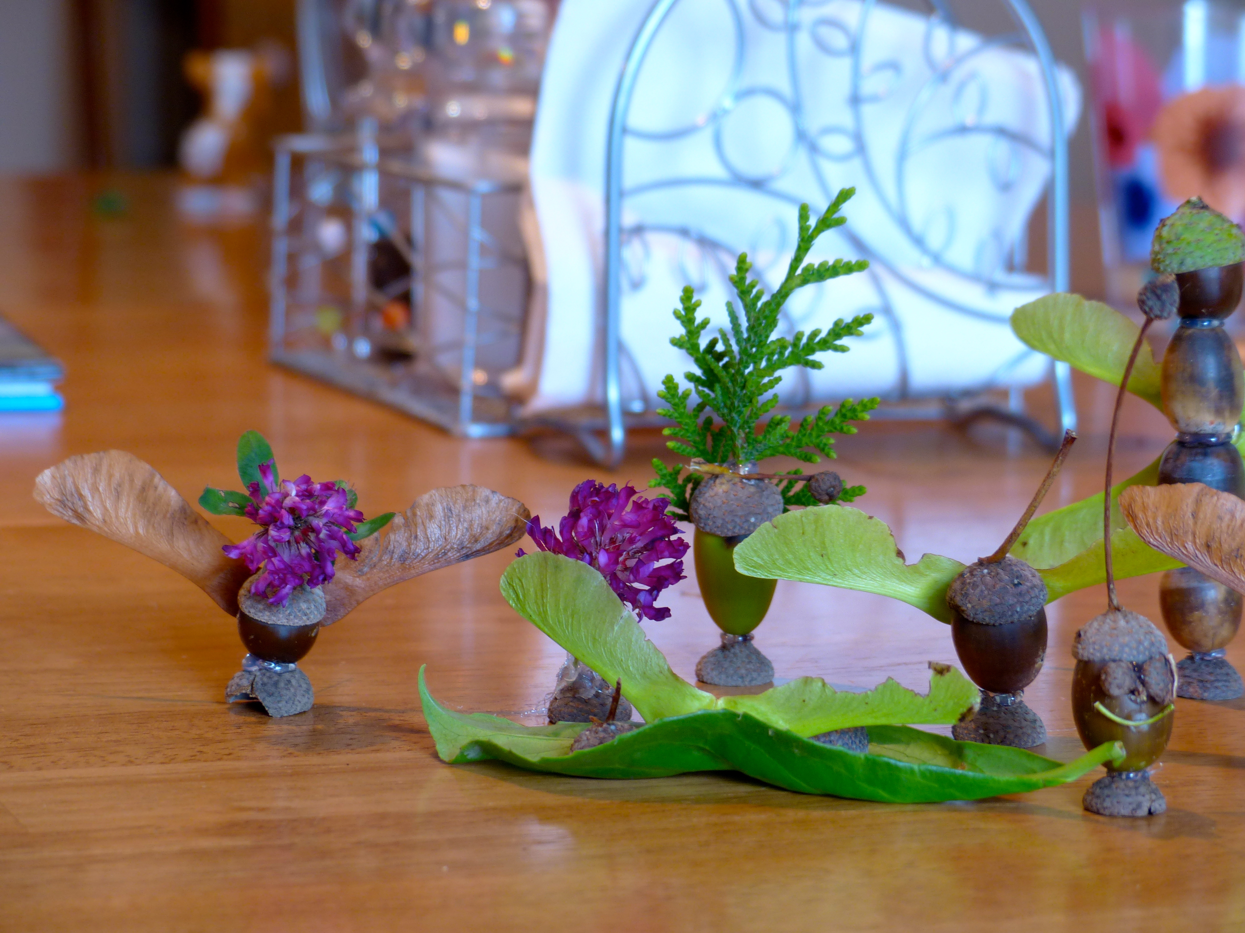 In Germany last month we wandered the paths everyday. How could we not? The scenery was breathtaking, the wild fruit was plentiful and there were so many little treasures to gather along the way. One afternoon we brought those treasures home and had a blast glueing them together into figurines. I wielded the glue gun and each of the girls told me where to put the glue so they could assemble the figure from their imagination. Much hilarity ensued. When we were done and the figures had dried, the girls played with them until they fell apart, back into the pieces they had originally been – a simple acorn, leaf, twig or flower. For this activity, the joy was completely in the process.