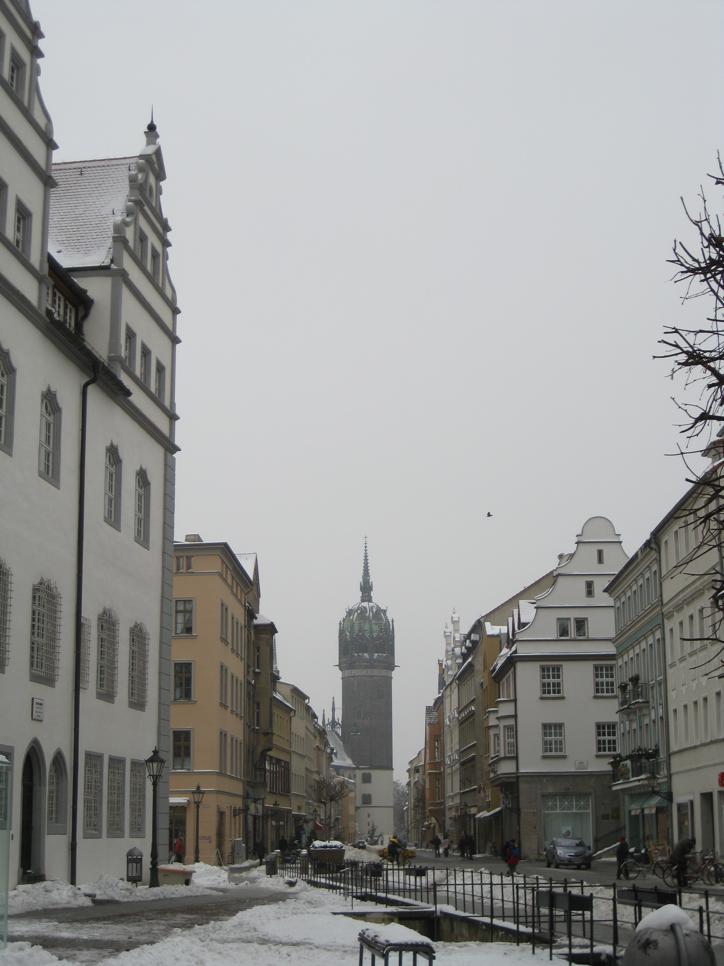 We visited Lutherstadt-Wittenberg on a brutally cold January day. (As I recall, most days in Germany in January are brutally cold.) We were some of only a dozen non-locals strolling the slushy pavement. Our industrial German stroller was certainly the only one leaving treadmarks on the sidewalk. We easily reached the town by train from Leipzig. Once in the medieval town, everything was within walking distance.