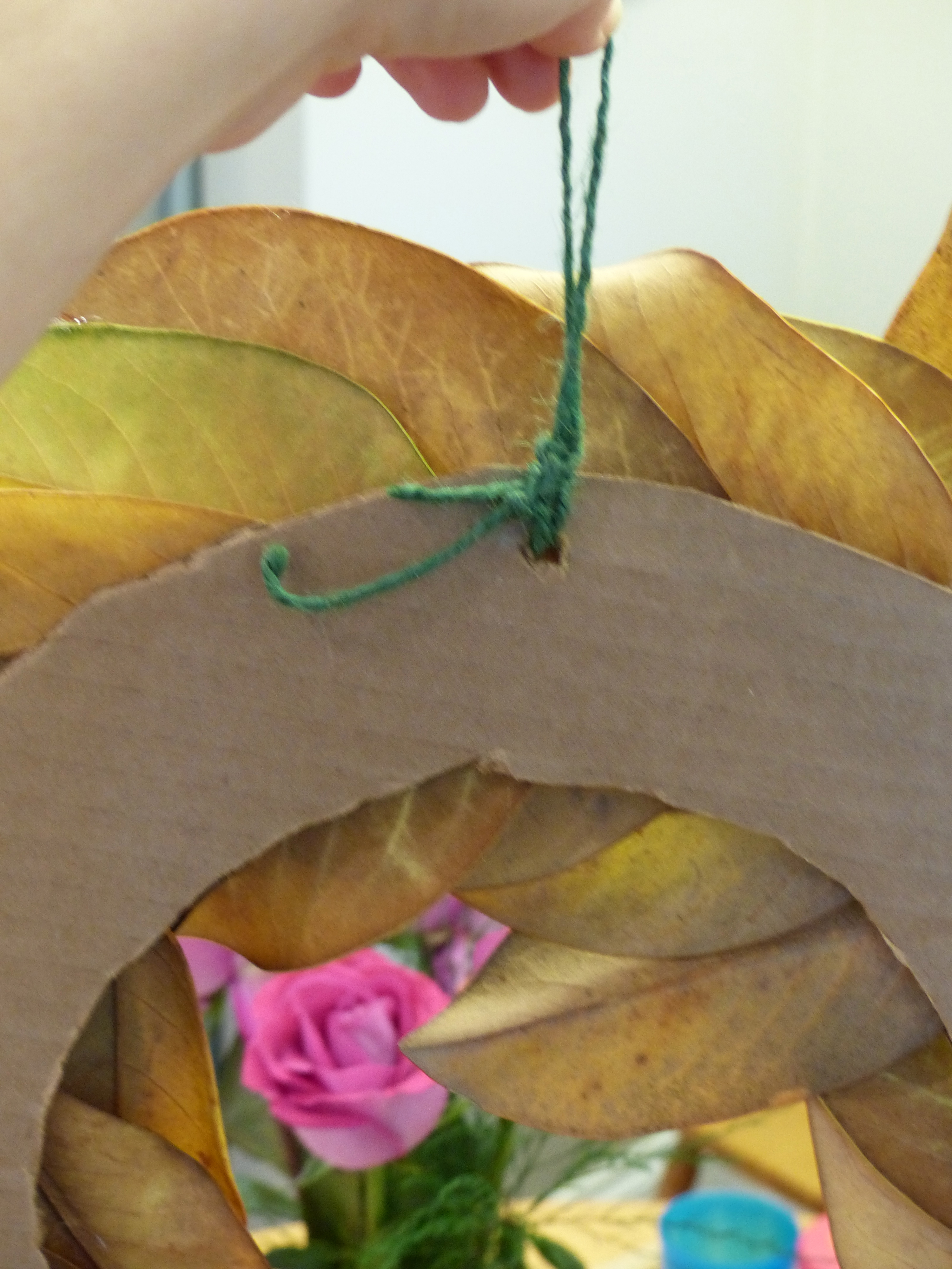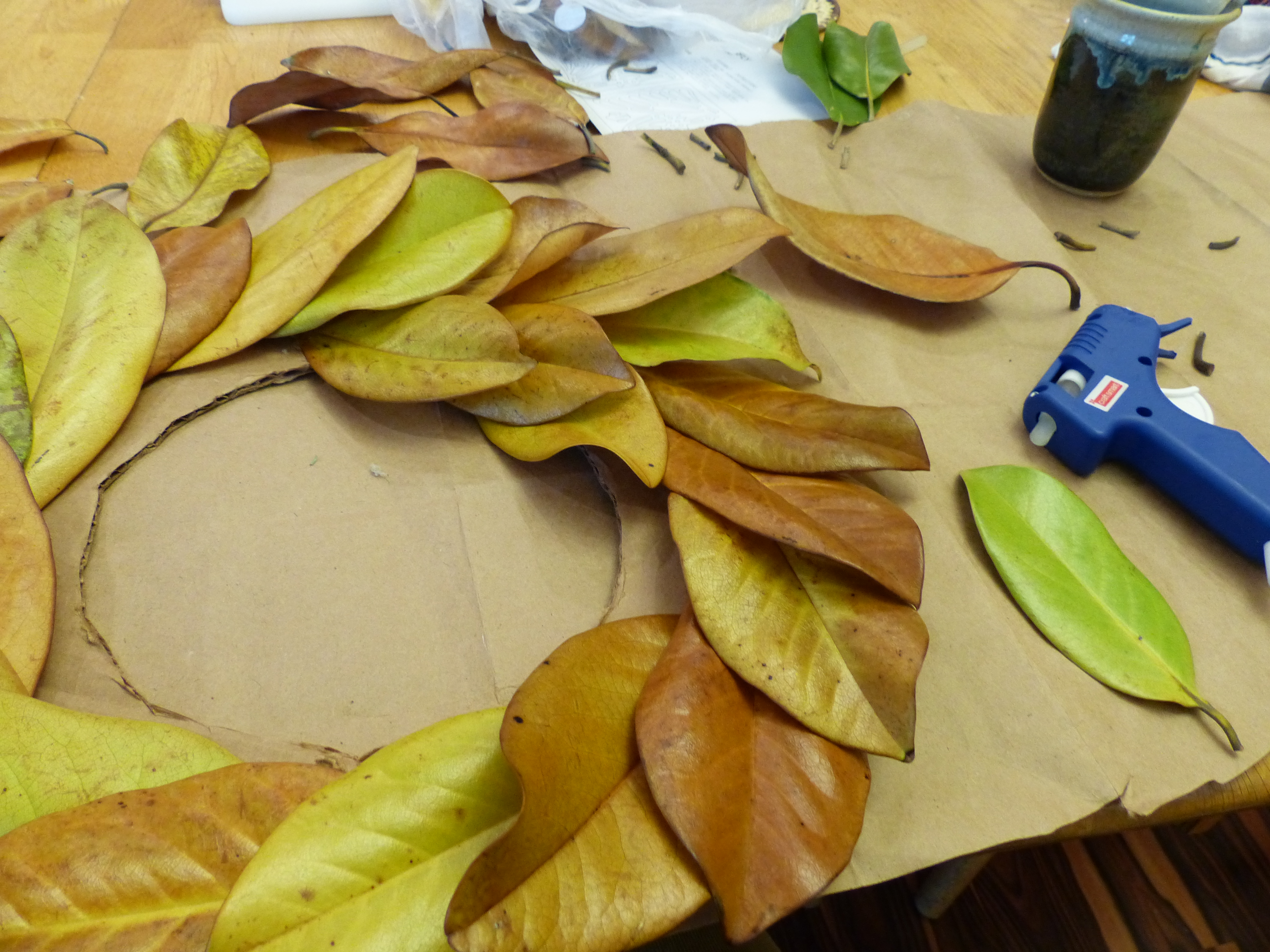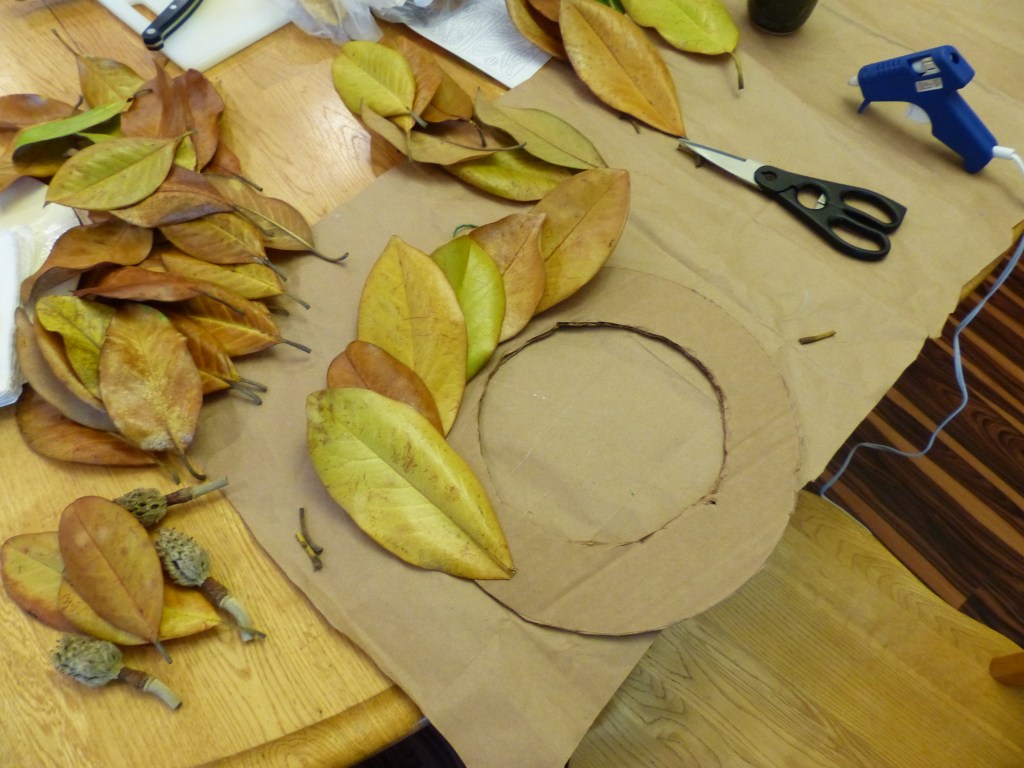 My research on wreath creation suggested items such as foam and floral wire. We’re a cardboard, paper sack, tape kind of family, though I did recently buy a glue gun. Those supplies are plenty sufficient to create a wreath. With my trusty assistants who helped collect, then trimmed stems and sorted leaves, we created this seasonal décor with a nod to our “Southern” locale. We won’t always live near magnolia trees.