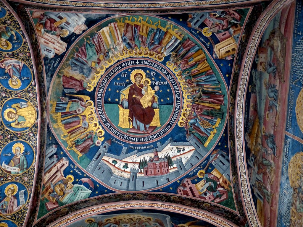 One foggy afternoon in October we turned off the main road that skirts the southern Carpathians and headed straight into the foothills. Signs directed us to the UNESCO World Heritage Horezu Monastery. Several kilometers of road dead-ended at a large gate and medieval stone walls. The monastery and surrounding buildings on the hillside were shrouded in mist. I had seen pictures of the church complex with snow-capped ranges in the distance and gorgeous fall colors covering the hills. This was not a day to capture those types of photos, unfortunately. However, the architecture and brilliantly colored frescoes can be appreciated no matter the clime.
