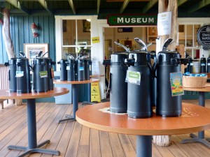 Kauai is home to the largest coffee plantation in the United States. The Big Island and Molokai also have coffee plantations, but they are not as expansive as Kauai’s coffee-laden, verdant hills. The Kauai Coffee Company is open to the public with a free walking tour of the facility, which highlights the coffee process from seed to cup. The gift shop had the nicest staff along with supplying tasteful gifts and artisanal coffee not available for export – it’s only sold in their shop. Of course, these are minor details. The important thing to note is there is unlimited, free coffee tasting! Tables on the veranda hold fresh brew organized by roast (dark, medium, light). Then there was the one table off to the side where the kids picked up their habit. We allowed them to sample the decaf.