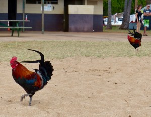 Shimmering plumage struts across streets and into restaurants. Fiesty birds meander on the sand, weaving through sunbathers. Wherever you find yourself on Kauai, you will likely find gorgeous, wild, pesty chickens. They reminded me of the baboons in Livingstone, Zambia, which would enter restaurants to steal food off your plate or hop through an open car door to rummage for snacks. As much as they are a nuisance, chasing chickens, like chasing pigeons in a European piazza, became a daily, much-anticipated past time. Waiting for food at a restaurant? Chase the chickens. Waiting in line at a public bathroom? Chase the chickens. And when a hen with a day-old brood of chicks comes by, watching the critters has a cute factor we’re not accustomed to (we don’t live on a farm). It was all I could do to keep the kids from picking them up, continually reminding them that these chickens are wild, filthy, disease-ridden birds, just like the pigeons in Lyon that swoop down to eat vomit (sorry, it’s true, and beared repeating to make my point).